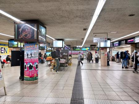 駅広告は、駅の壁面・柱・フロア・天井など、さまざまな場所を使った広告です。電車の乗客だけでなく、駅周辺の商業施設や駐車場を利用する人、駅を通行する人などにも見ていただくことができます。